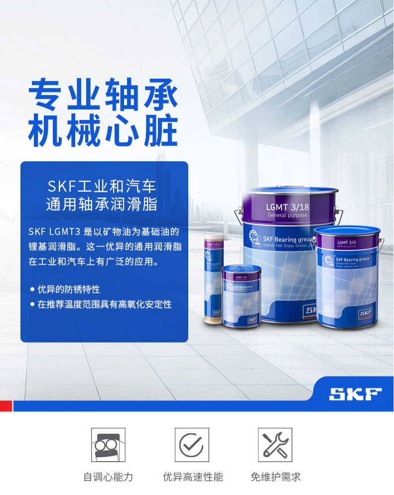 SKF工业和汽车通用轴承润滑脂 SKF LGMT3是以矿物油为基础油的锂基润滑脂。这一优异的通用润滑脂在工业和汽车上有广泛的应用。 优异的防锈特性 在推荐温度范围具有高氧化安定性...